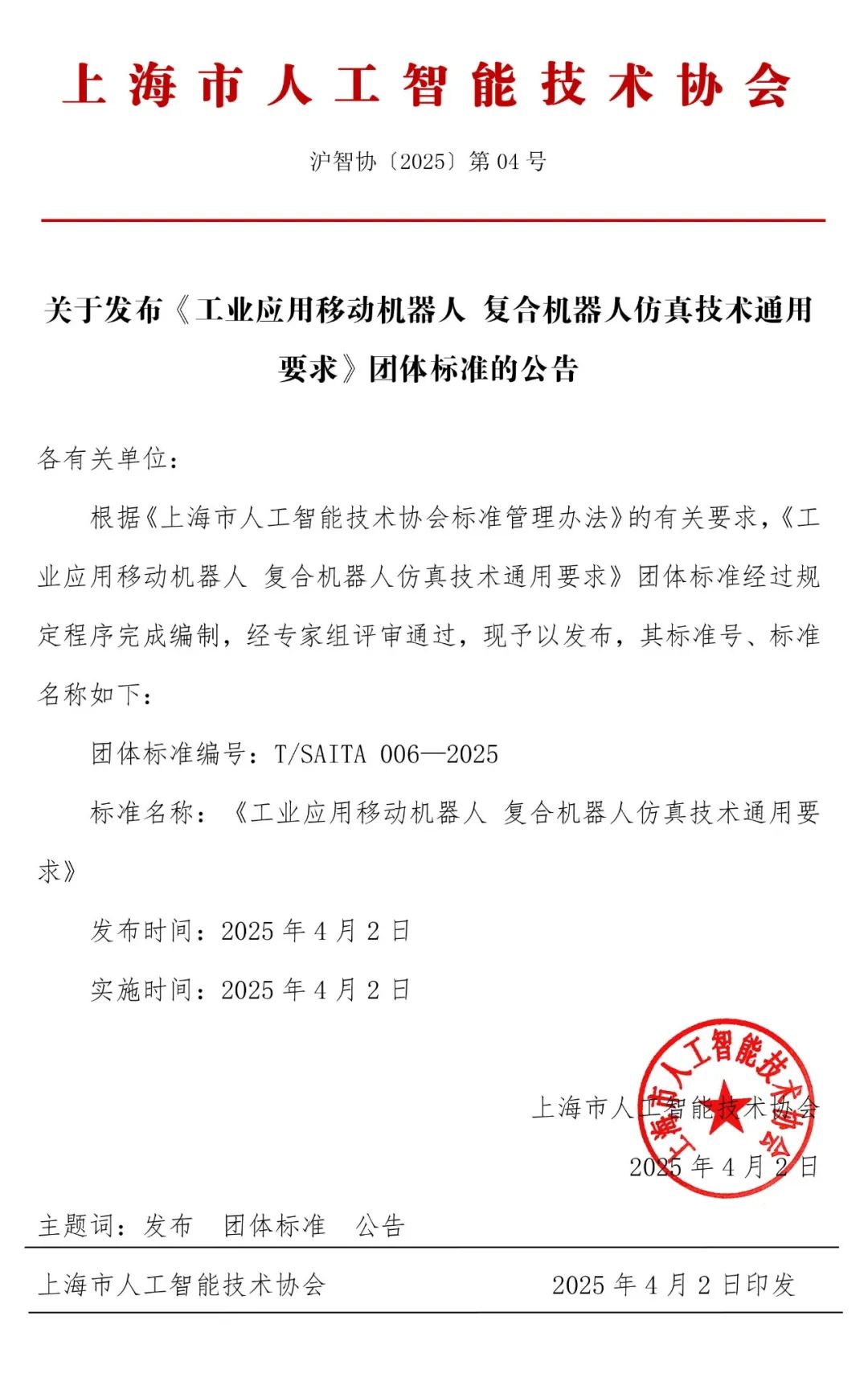 4月2日,上海市人工智能技术协会主导,祥符实验室深度参与编制的《工业应用移动机器人 复合机器人仿真技术通用要求》团体标准(T/SAITA 006-2025)正式发布实施。